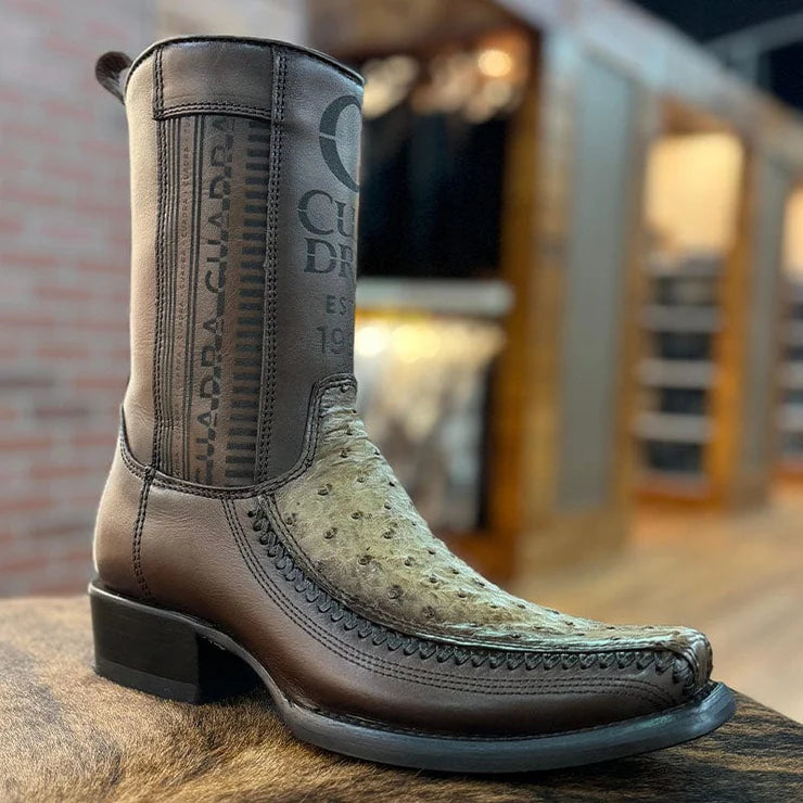Estas botas vaqueras para hombre de la marca Cuadra son el epítome de la elegancia y la exclusividad. Confeccionadas con piel de bovino y avestruz en tono café, sombreadas a mano con un diseño grabado a láser en el tubo. Además, cuentan con cierre lateral interno para una inserción más cómoda.