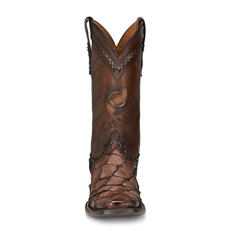 Bota Cuadra de piel genuina de pez pirarucú para hombre. Bota rodeo para hombre en piel genuina de pirarucú y piel bovina. Sobre el tubo presenta grabado láser del logo de Cuadra en el frente, detalles tejidos a mano y aplicación metálica del monograma de Cuadra.