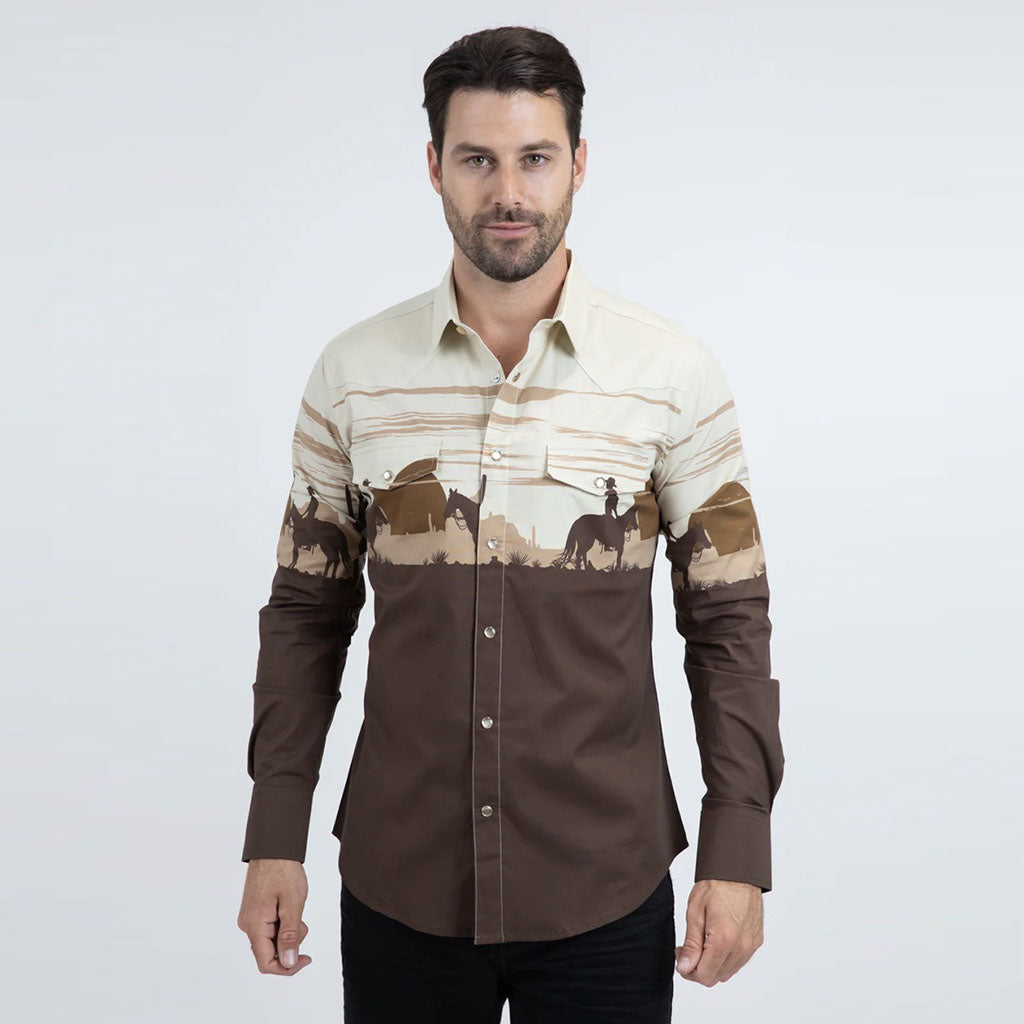 Luce un estilo único con nuestra camisa de algodón elástico con estampado panorámico Rodeo para hombre. Confeccionada en algodón premium con un toque de elasticidad, esta camisa luce un cautivador estampado panorámico de rodeo que le da un toque de estilo western a tu look. Su silueta de corte moderno ofrece una apariencia elegante y favorecedora, ideal tanto para ocasiones informales como semiformales.