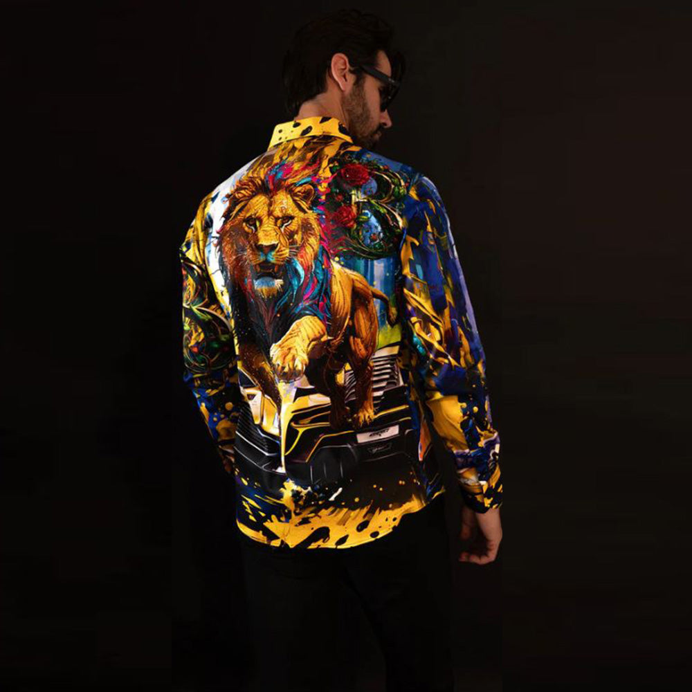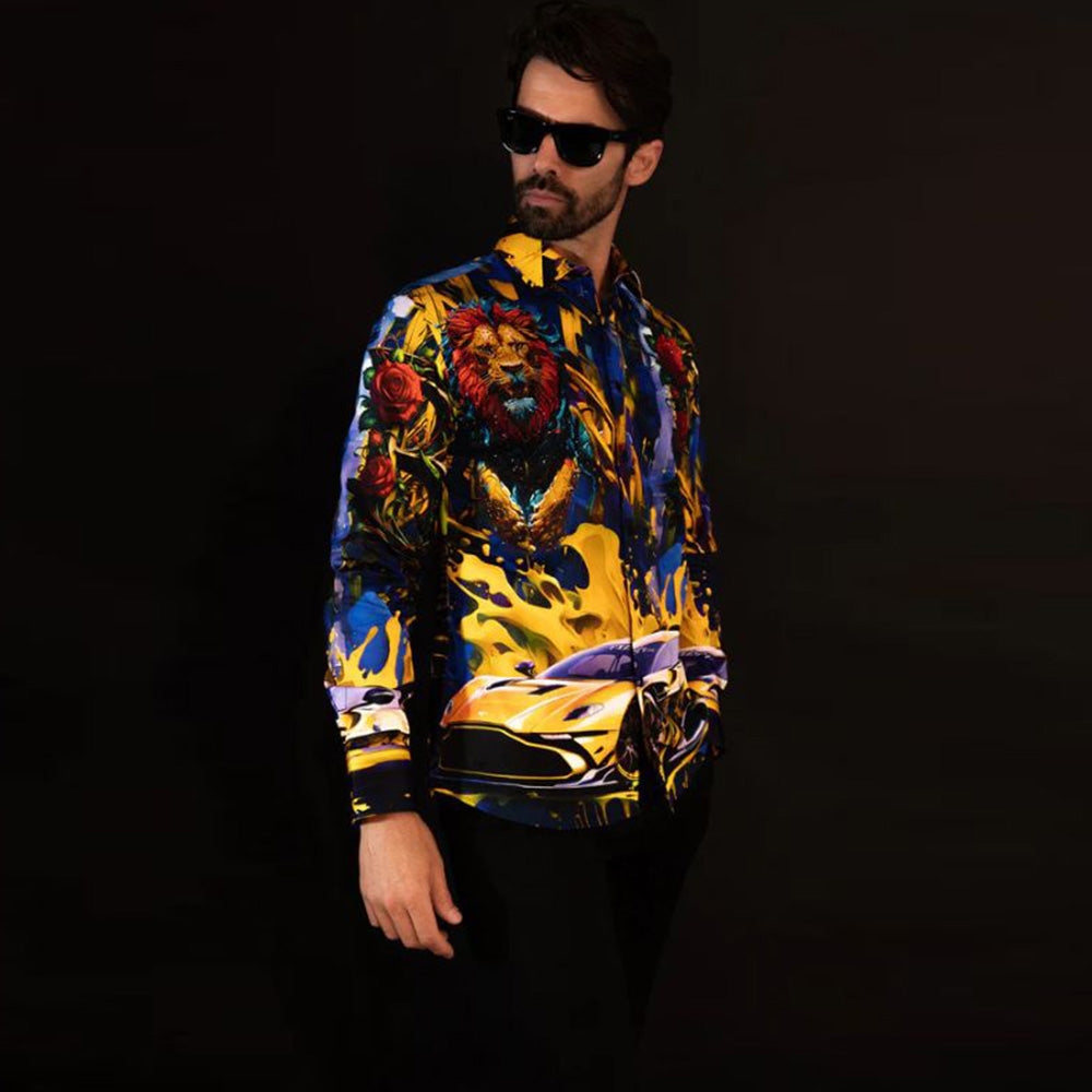 La camisa Breezery presenta un elegante diseño barroco elaborado con pedrería colocada a mano, que añade un toque de lujo a tu armario. Su corte entallado, su tejido ligero y sus mangas largas le dan un aspecto cómodo y elegante, mientras que los estampados florales, de leones y de coches deportivos le aportan un toque único. Esta original prenda está diseñada por Barabas.