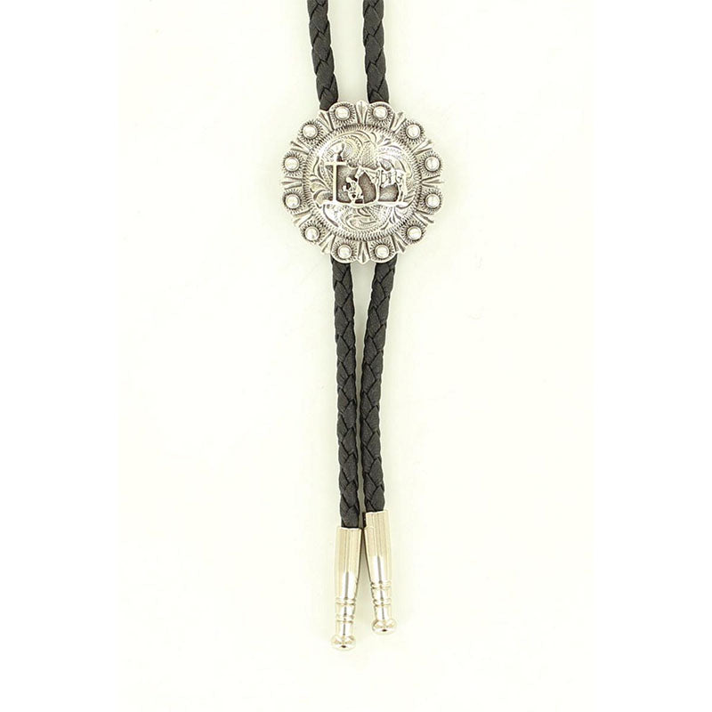 Es un accesorio icónico que refleja la fe y la tradición del estilo western. Presenta un medallón central con un diseño detallado de un vaquero orando frente a una cruz, rodeado de un borde plateado con acabados intrincados. Su cordón trenzado negro y puntas metálicas complementan este diseño lleno de significado. Ideal para quienes buscan expresar su espíritu vaquero con un toque de devoción y autenticidad.