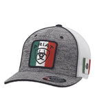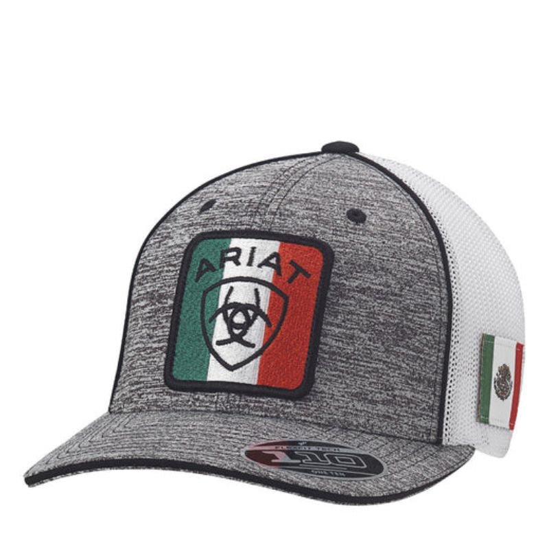Gorra única con el logotipo de la bandera mexicana de Ariat para hombre. Ya sea que te quedes en casa o estés en la ciudad, elegirás esta gorra de hombre Ariat de M&F Western Products. Hermosos paneles frontales y visera en gris jaspeado con un logotipo cuadrado de Ariat en los colores de la bandera mexicana. Los paneles traseros son de malla blanca con cierre a presión. 98 % poliéster, 2 % elastano PU.