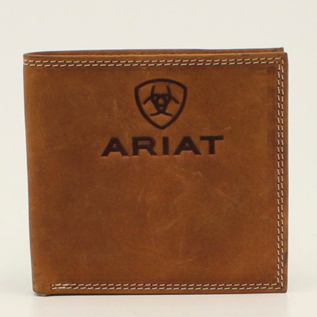 Manténgase organizado con esta billetera Ariat plegable extragrande de M&F Western Products. Piel auténtica con doble costura en contraste y el logotipo y escudo de Ariat grabados en la parte superior. Cuenta con múltiples compartimentos para tarjetas de crédito, efectivo y documento de identidad.
