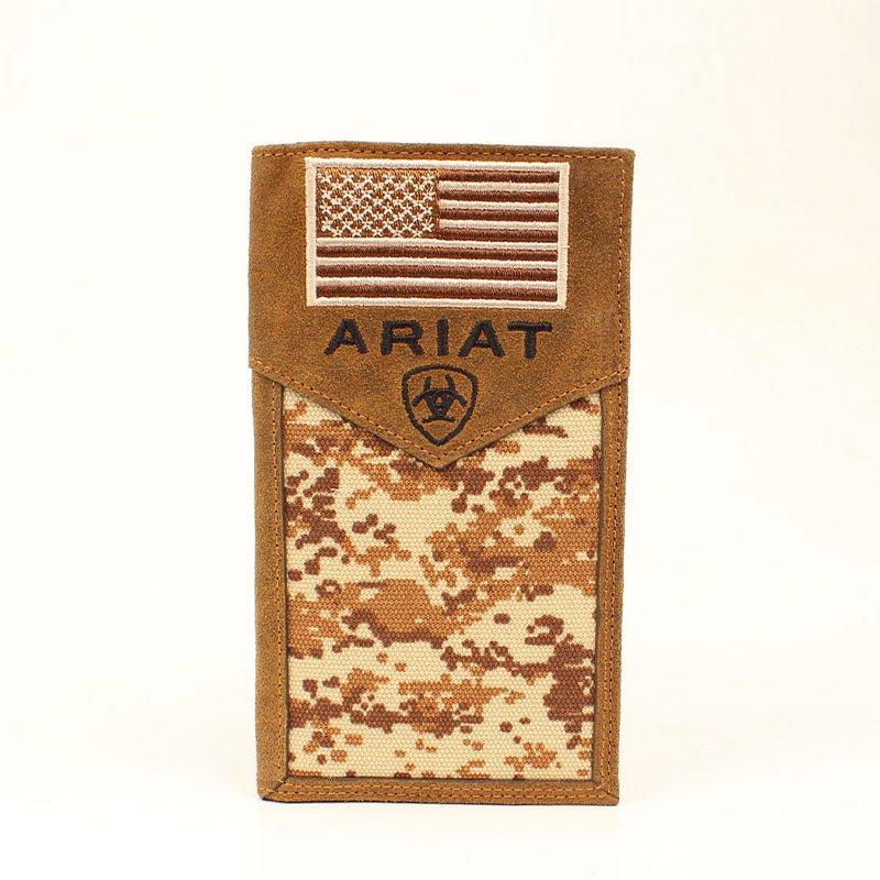 Esta billetera única presenta un centro de camuflaje digital marrón medio con bordes y superposición marrones. También hay una bandera de EE. UU. bordada con un logotipo exclusivo de Ariat en la parte superior de la billetera. En el interior, cuenta con múltiples compartimentos para sus tarjetas de crédito, efectivo y una ventana para identificación.
