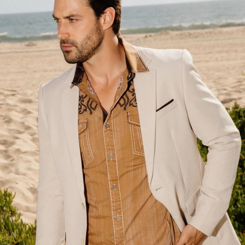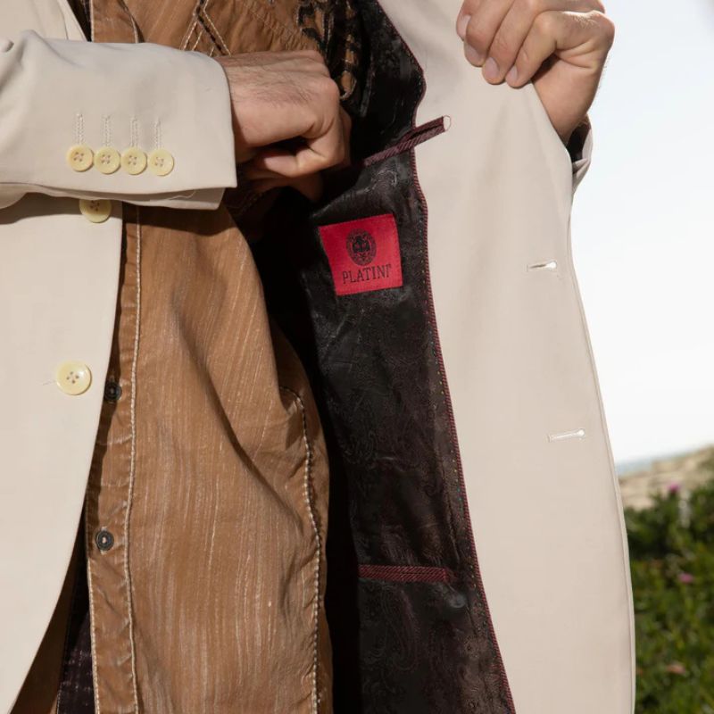 - Forro interior con el mismo diseño que el pañuelo de bolsillo falso para una apariencia cohesiva.