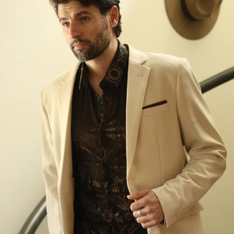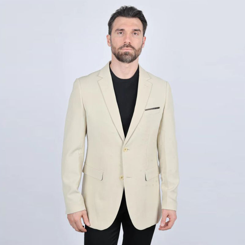 Realza tu conjunto de noche con nuestro blazer elástico de corte moderno para hombre, diseñado meticulosamente para lograr sofisticación y versatilidad. Este elegante blazer presenta dos bolsillos falsos en la cadera y un bolsillo en el pecho adornado con un pañuelo de bolsillo fijo en contraste, lo que le aporta un toque distintivo.