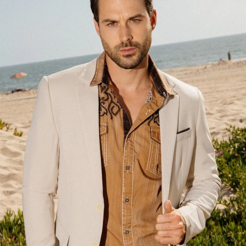 - Bolsillo en el pecho con un pañuelo de bolsillo fijo en contraste para darle un toque de estilo.