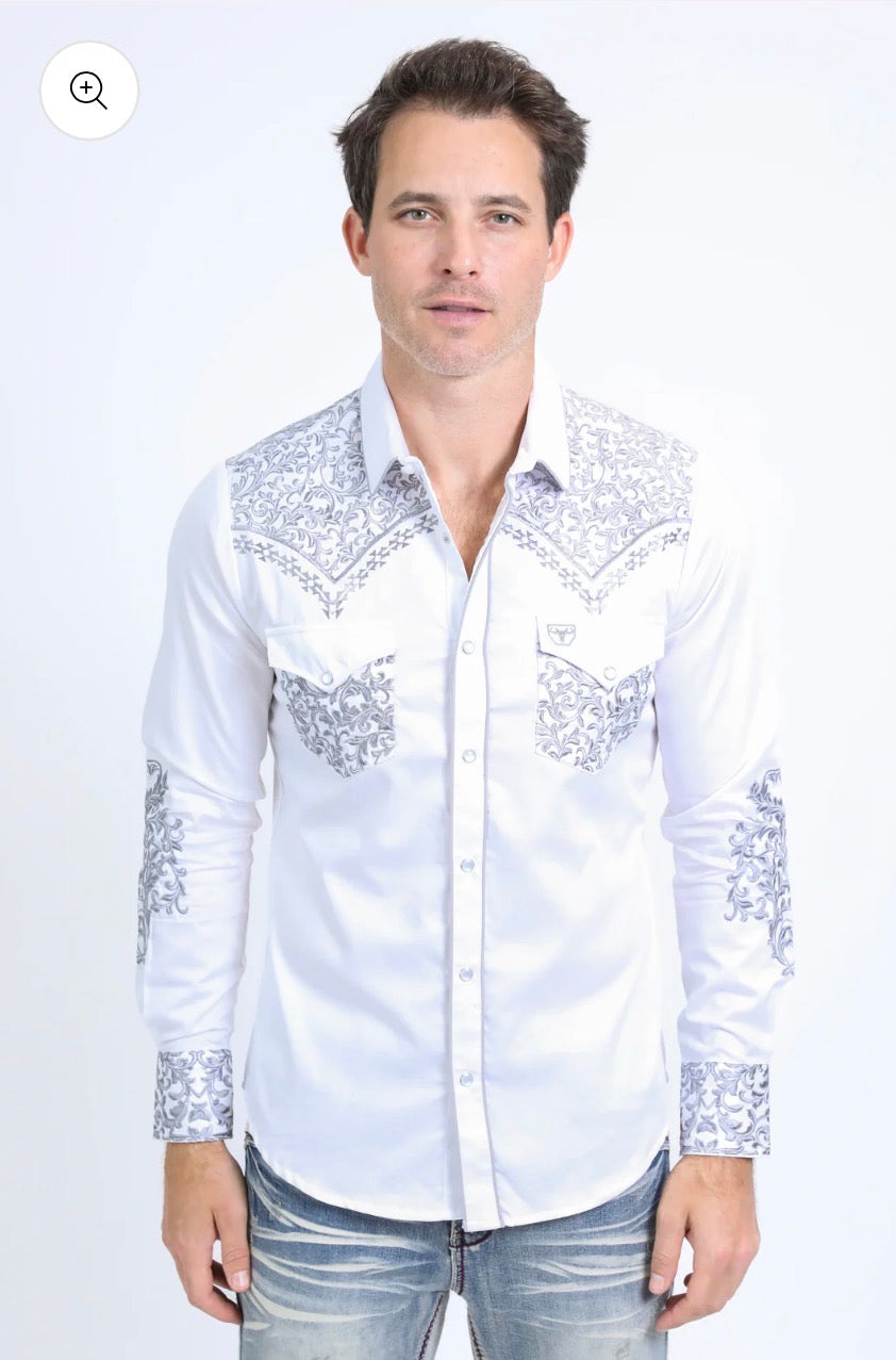 Luce un estilo con nuestra camisa de manga larga elástica con bordado moderno para hombre. Esta versión moderna de la clásica camisa vaquera presenta un bordado intrincado y un cómodo corte elástico. Perfecta tanto para salidas informales como para looks de inspiración vaquera.