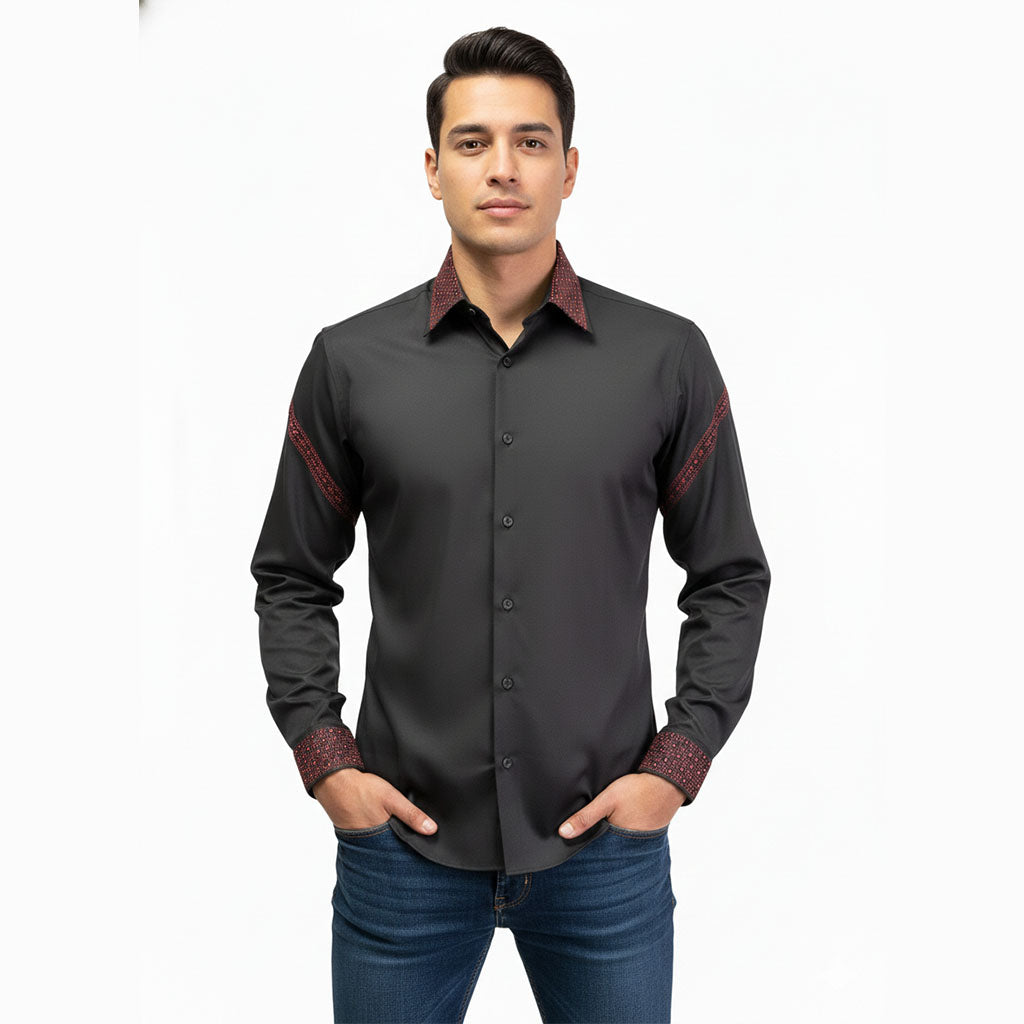 Domina la noche con esta camisa de satín negro que desafía la convención. El cuello adornado con piedras rojas brillantes crea un contraste audaz que captura todas las miradas. Confeccionada en satín suave y lujoso, esta prenda combina elegancia sofisticada con un toque de rebeldía. Perfecta para quien se atreve a destacar, ya sea en una salida especial o una noche de confianza absoluta. Versátil, atrevida y completamente irresistible.