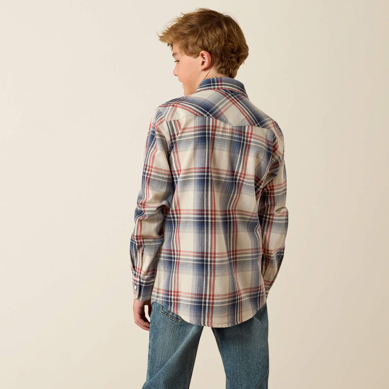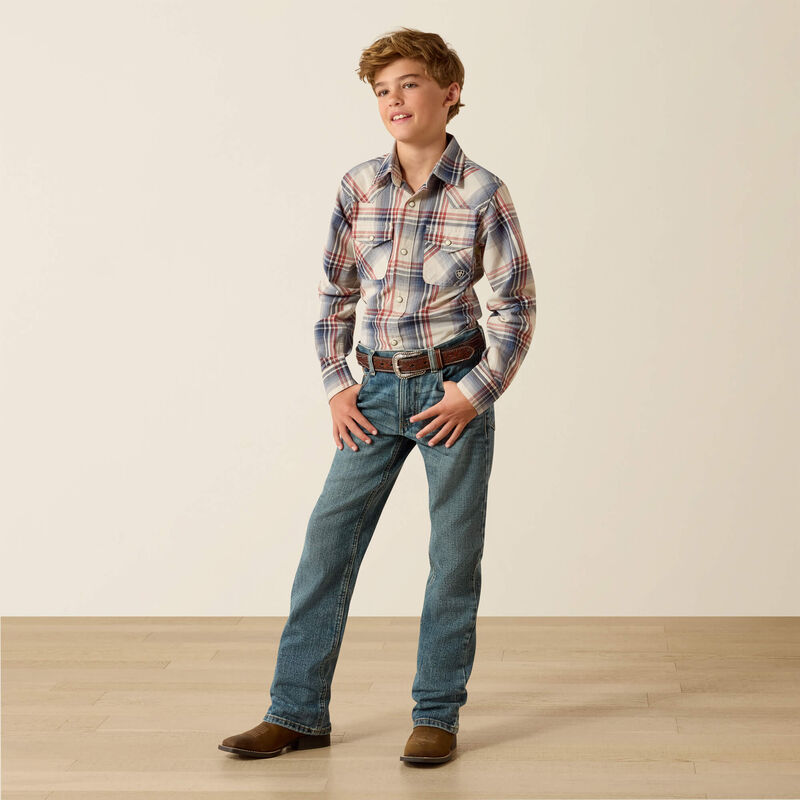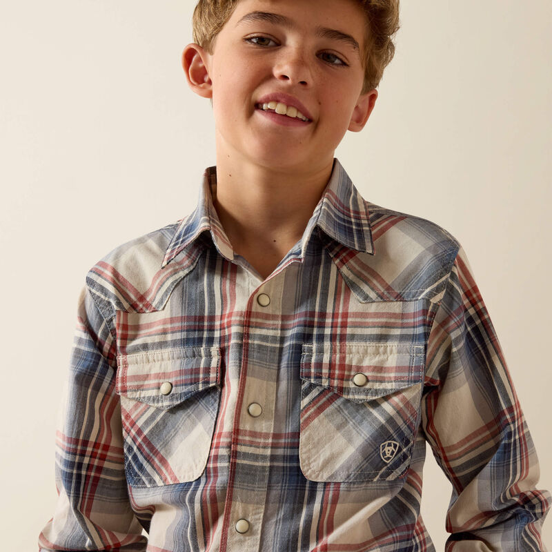 Toda estrella de rodeo en ciernes necesita una camisa clásica con broches. Esta combina el icónico estilo del Oeste con un estampado tradicional a cuadros que querrán usar desde la escuela hasta el establo y a todas partes.
