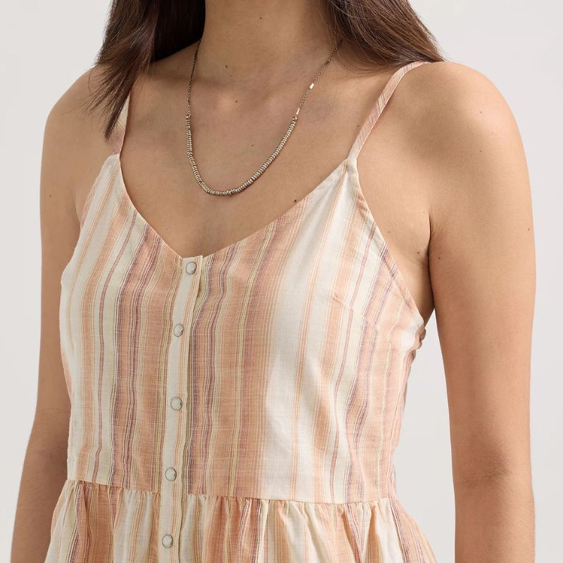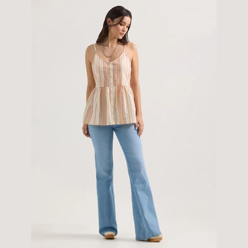 Para esos días en que tus broches vaqueros favoritos necesitan un descanso, nuestra camiseta sin mangas Wrangler Retro® con peplum y broches frontales está lista. Esta camiseta sin mangas con tirantes está confeccionada en una ligera mezcla de algodón con rayas en tonos rosa y melocotón. Presenta escote redondo, tirantes ajustables y cintura peplum para darte volumen. Además, sus broches de perla le darán un toque auténtico a tu look.