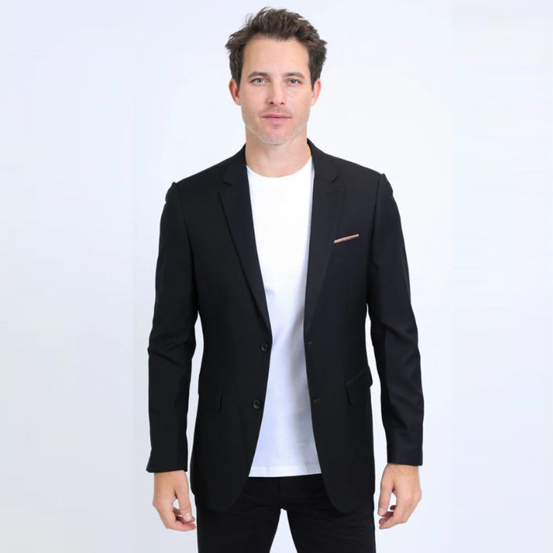 Realza tu look de noche con nuestro Blazer Elástico de Corte Moderno para Hombre, diseñado meticulosamente para ofrecer sofisticación y versatilidad. Este elegante blazer cuenta con dos bolsillos falsos en la cadera y un bolsillo en el pecho adornado con un pañuelo de bolsillo fijo en contraste, lo que le aporta un toque distintivo.