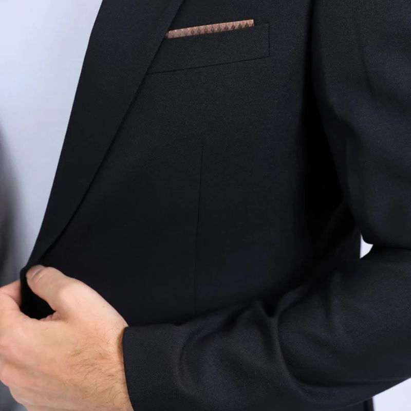 - Bolsillo en el pecho con un pañuelo de bolsillo fijo en contraste para darle un toque de estilo.