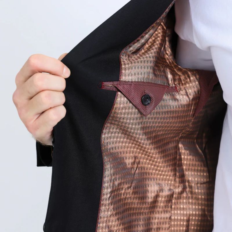 - Forro interior con el mismo diseño que el pañuelo de bolsillo falso para una apariencia cohesiva.