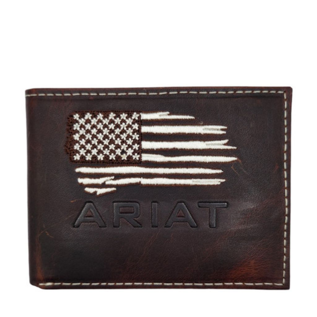 Esta billetera plegable Ariat de M&F Western Products tiene un cuerpo de cuero marrón auténtico envejecido con una bandera estadounidense bordada en blanco y marrón y el nombre Ariat debajo. El interior tiene un forro de nailon negro, ranuras para tarjetas de crédito y un bolsillo transparente para identificación.
