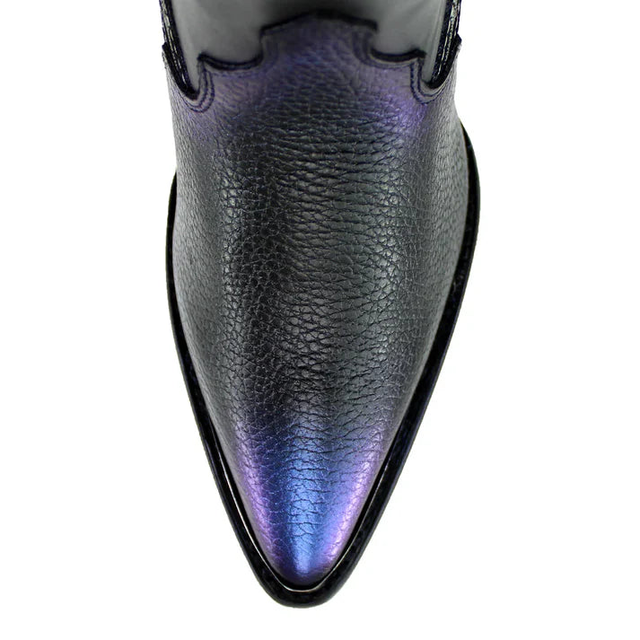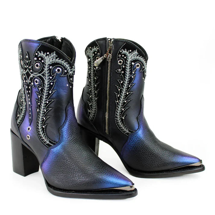 Estas botas Cuadra para mujer muestran una audaz combinación de bordados metálicos y detalles tachonados en elegante cuero negro, que ofrecen un estilo occidental llamativo y moderno.