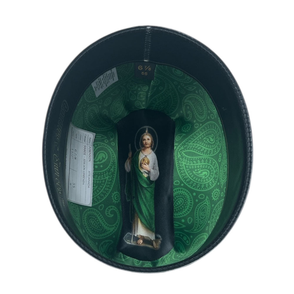 El Sombrero Johnson San Judas 5000X es una obra maestra del estilo western con un toque espiritual. Fabricado con materiales de alta calidad y acabado fino, este sombrero rinde homenaje a San Judas Tadeo, símbolo de protección, fe y fortaleza.